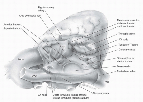 ![]() FIG. 19.2 Surgical anatomy of the right atrium. SVC, superior vena cava; SA, sinoatrial; IVC, inferior vena cava; AV, atrioventricular. |