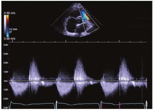 17. Continuous-wave Doppler at the pulmonic valve in a 42-year-old woman with right ventricular dilatation (Fig. 28-3). Which of the following findings by itself can establish the definitive diagnosis?