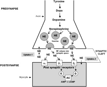 It is known that activation of the sympathetic nervous system (SNS) occurs in systolic HF as shown in Figure 1 . Overactive sympathetic innervation involves increased release of norepinephrine (NE), the main neurotransmitter of the cardiac SNS. In response to sympathetic stimulation, NE is released from vesicles into the neuronal synaptic cleft. The released NE binds to postsynaptic beta-1, beta-2, and alpha-receptors; amplifies adenyl cyclase activity; and produces the desired cardiac stimulatory effects. NE is then reabsorbed into the presynaptic space for storage or catabolic disposal, terminating the synaptic response by the uptake-1 pathway. The increased release of NE usually correlates with decreased NE reuptake, which further increases circulating NE levels. This abnormal activation of the SNS eventually leads to further disease progression.