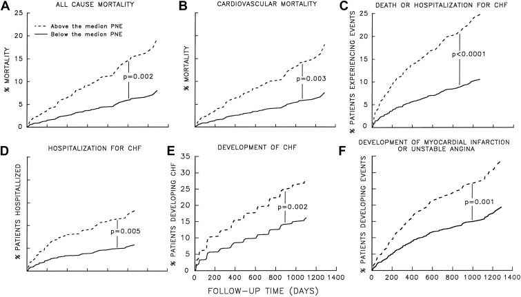 Excess sympathetic stimulation leads to increased myocardial stress, ischemia, and fibrosis. Elevated NE levels and the degree of sympathetic activation correlate with prognosis. Increasing levels of plasma NE activity are associated with worsening prognosis in patients with both asymptomatic left ventricular dysfunction and HFrEF. As seen in Figure 2 , all-cause mortality, cardiovascular mortality, development of HF, hospitalization for HF, and development of acute coronary artery syndrome are all more likely in the presence of increasing plasma NE activity.